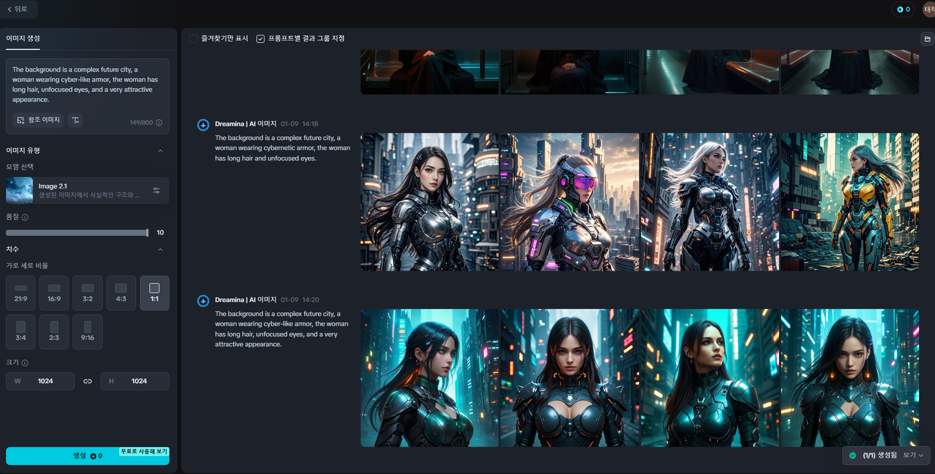 나 같은 경우도 현재 하루 사용을 해 보았기 때문에 많은 테스트를 해보진 않았지만, 확실한 것은 프롬프트가 자세할수록 내가 원하는 사진이 생성된다는 점이다.