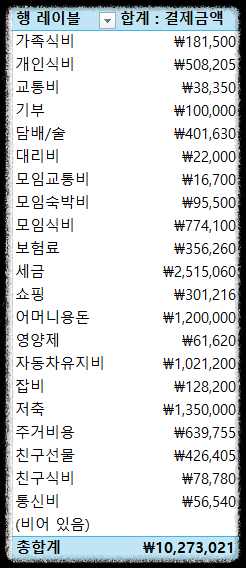 - 일단 위의 결과 사진에서와 같이 어떤 항목으로 얼마를 썼는지가 한눈에 보이니 내 소비 패턴이 확인되었다.