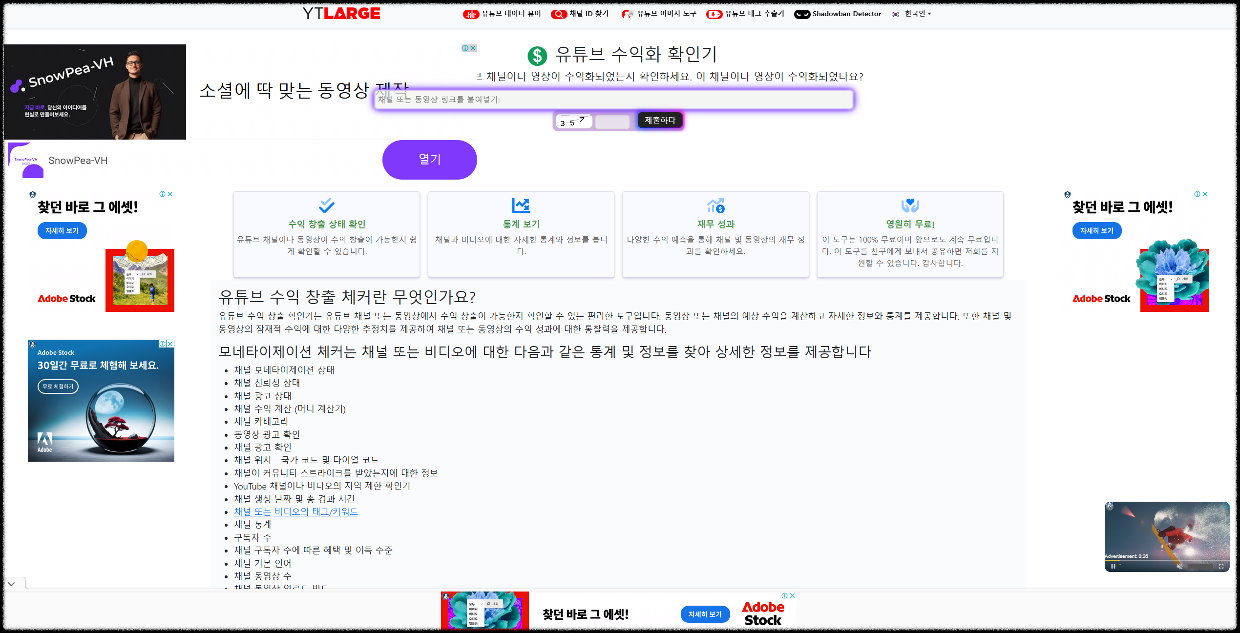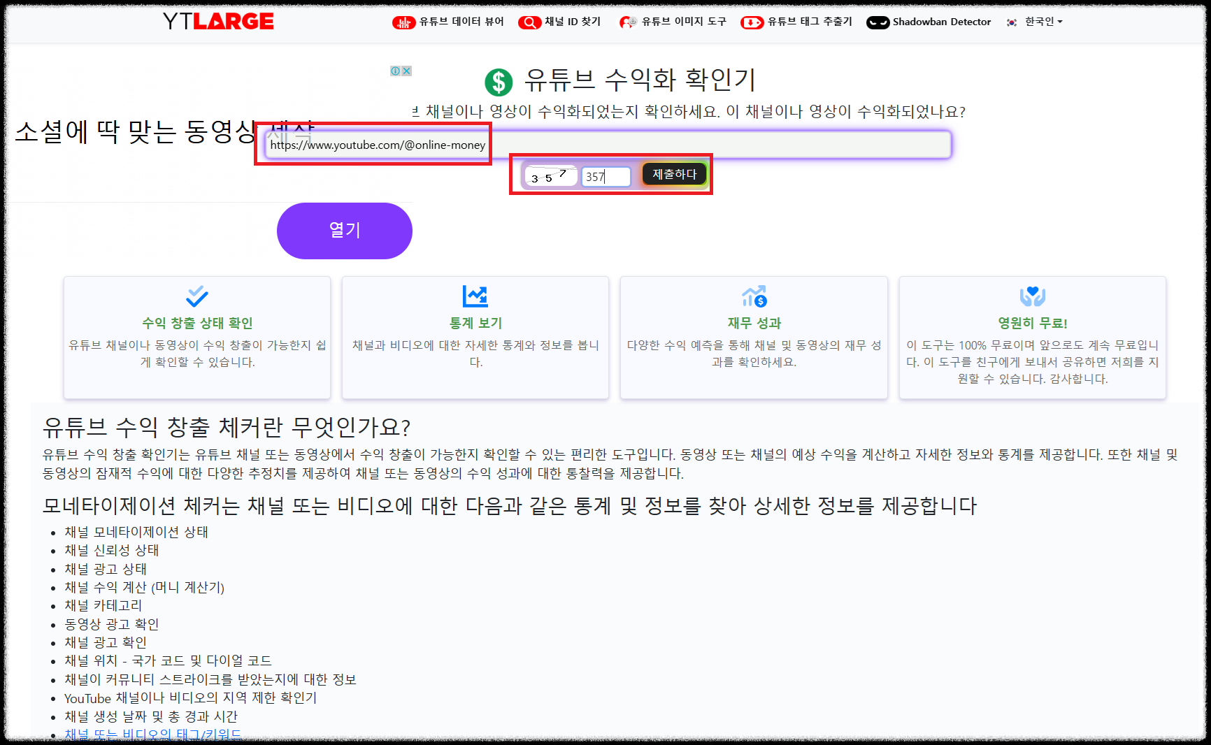 유튜브 수익 창출 확인 도구는 유튜브 채널 또는 동영상에서 수익 창출이 가능한지 확인할 수 있는 편리한 플랫폼입니다. 동영상 또는 채널의 예상 수익을 계산하고 자세한 정보와 통계를 제공