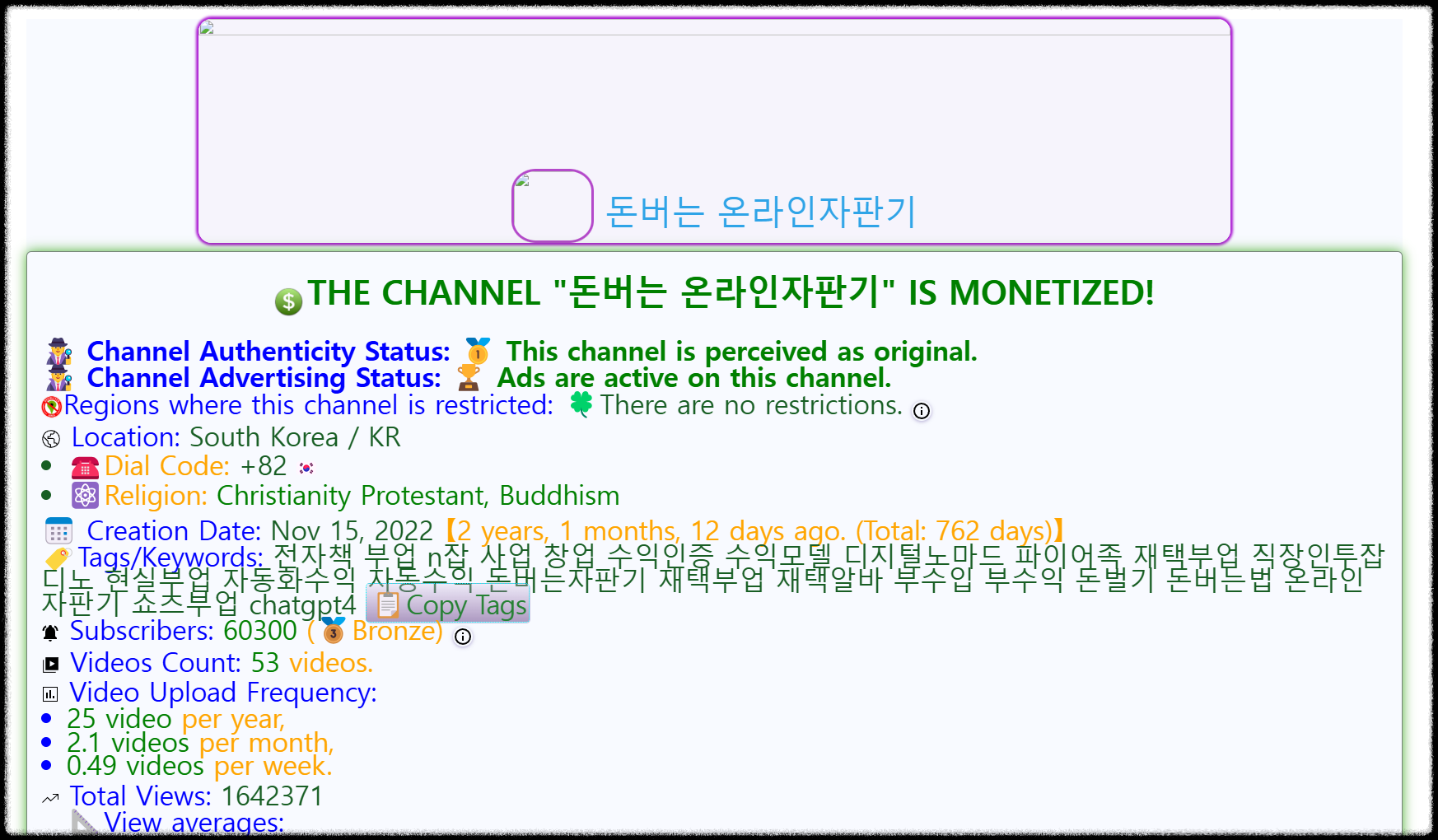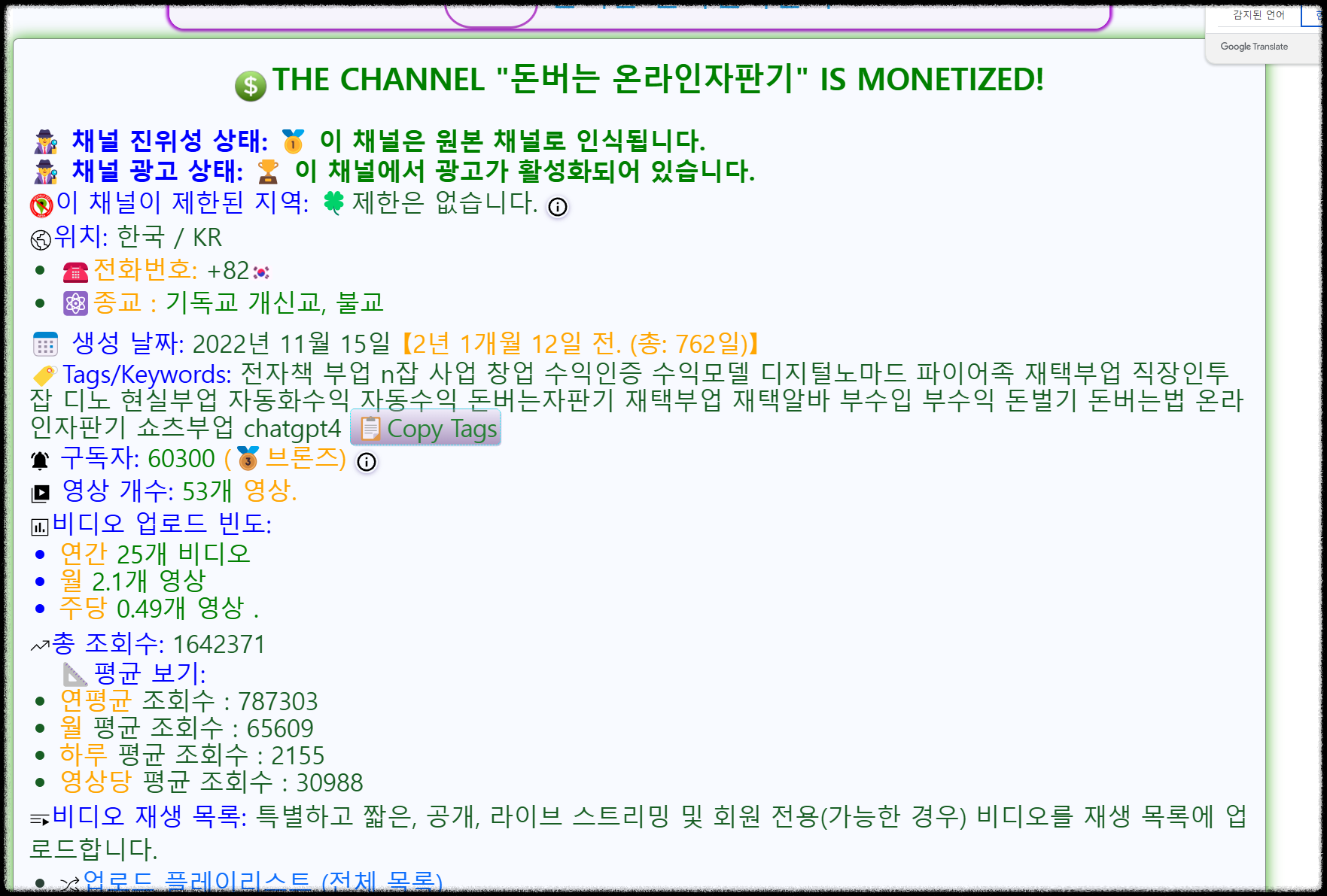 - 한글로 번역을 해보면? 해당 채널은 수익을 창출하다라고하는 수익가능 여부가 나오며, 생성날짜, 채널의 영상 수, 구독자 등을 확인해 볼 수 있다.