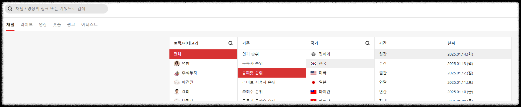 - 채널 토픽/카테고리별로 선택이 가능하며, 인기 순위, 구독자 순위, 슈퍼챗 순위, 라이브 시청자 순위, 조회수 순위 등 다양한 기준으로 선택이 가능하다.